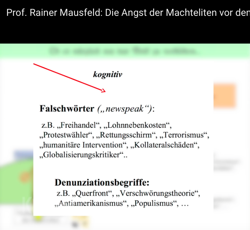 - Vortrag von Prof. Rainer Mausfeld über Diffamierungstechniken (v. a. Methode der Verklammerungstechnik): Die Angst der Machteliten vor dem Volk. Demokratiemanagement durch Soft-Power-Techniken (Prof. Mausfeld: „Besonders beliebt sind ‚Querfront‘ und ‚Verschwörungstheorie‘.“), Übersicht Falschwörter und Denunziationsbegriffe (Bild), Immunisierung durch Aufklärung (Albrecht Müller: „die eigenen Anhänger und über sie auch die Wähler […] immunisieren“), weitere themenbezogene Links